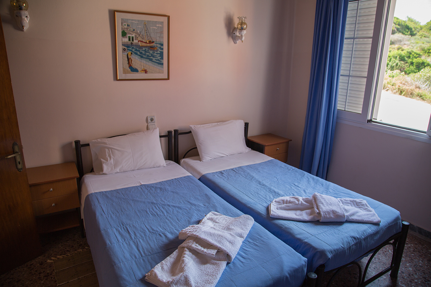 Simply stunning views across the bay towards the setting sun Mihalis apartment offers 1 double bedroom, 3 twin bedrooms, a recently modernised bathroom and a fully equipped kitchen diner.